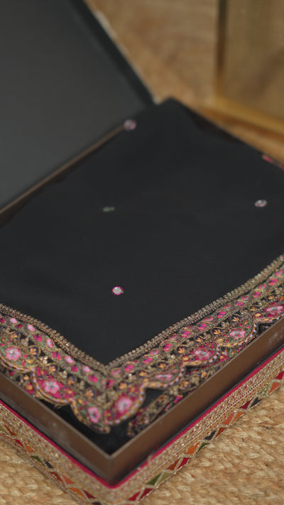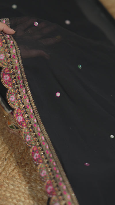 Aditi Black: Black Pure Georgette Handwork Saree with Black Georgette Multi Colour Thread Work Blouse