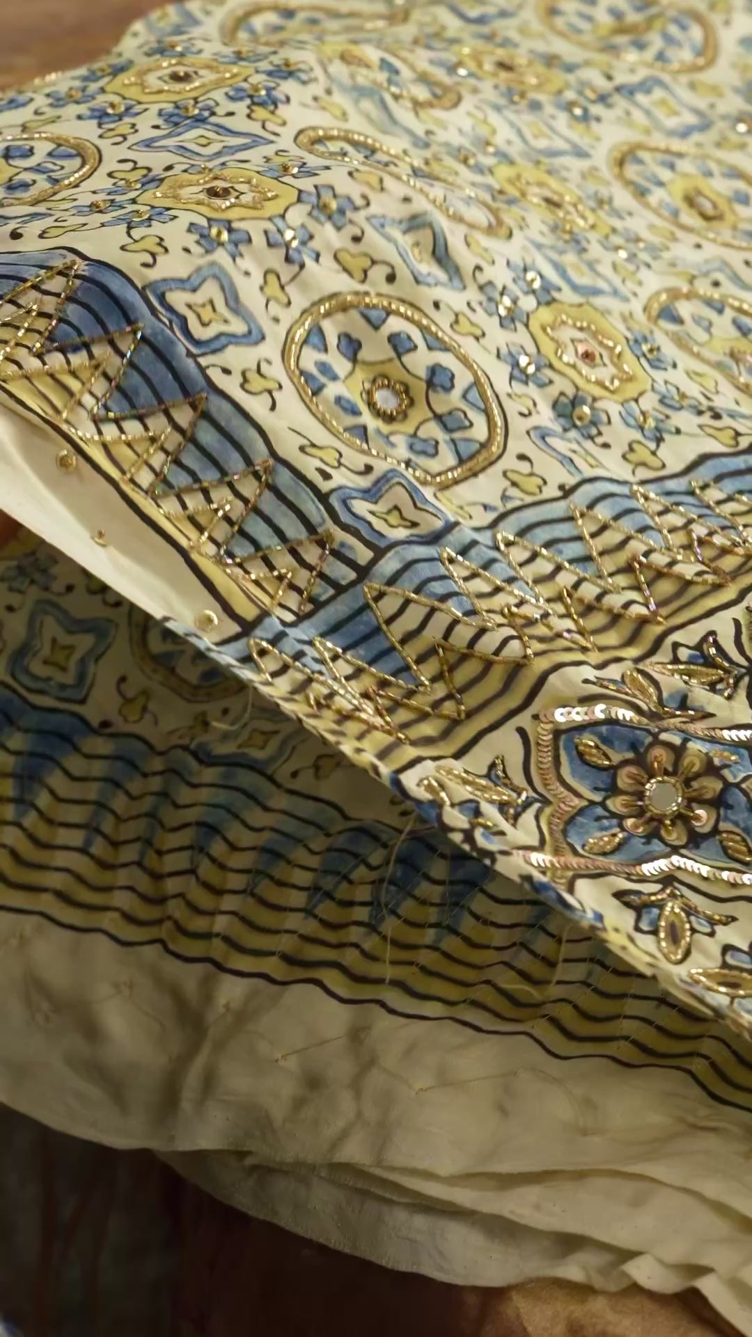 Banana Split: Cream and Blue Ajrakh Hand Block Print Saree on Modal Satin with Handwork | Self Blouse with Handwork