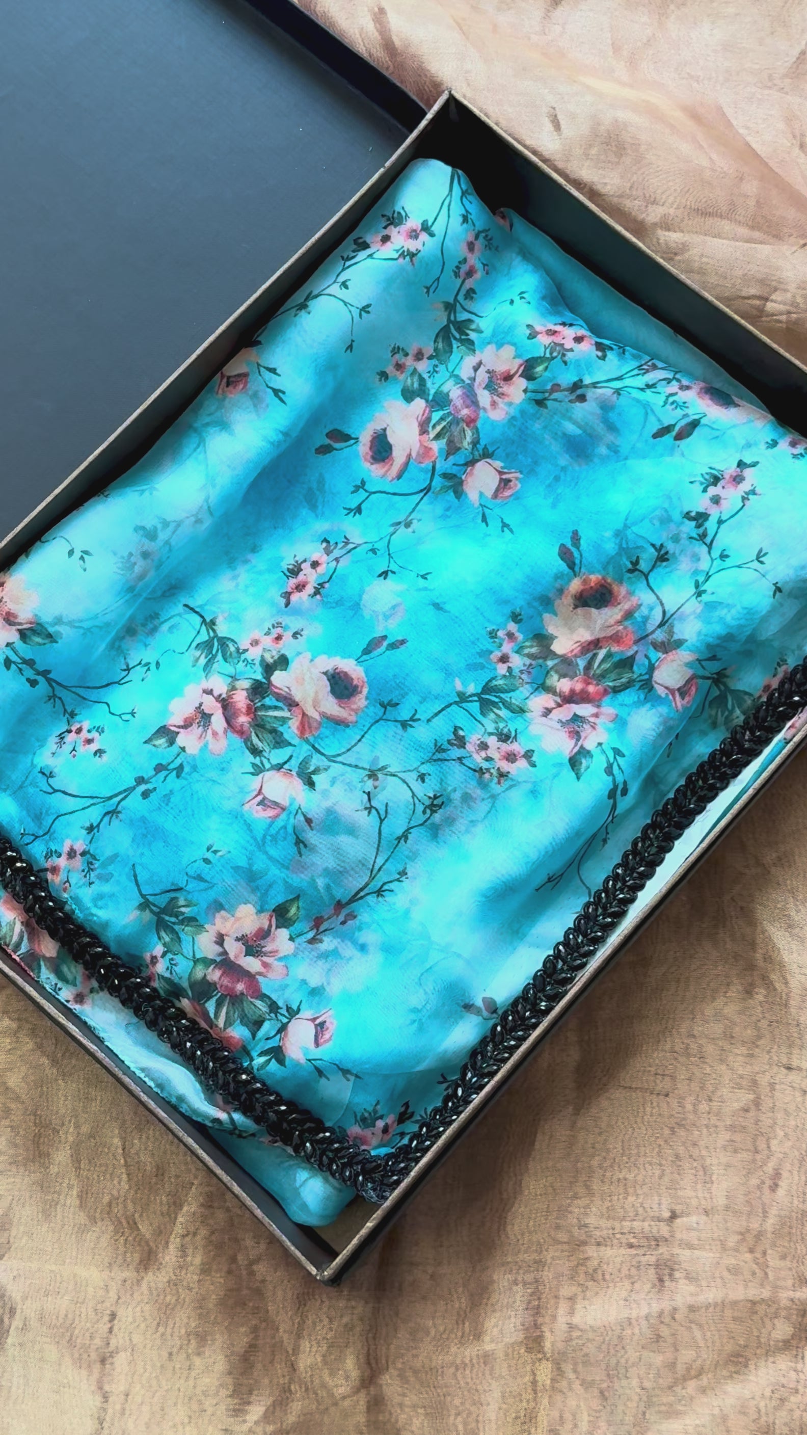 Chaandni: Blue Floral Print Cleopatra Chiffon Saree with Black Premium Satin Blouse