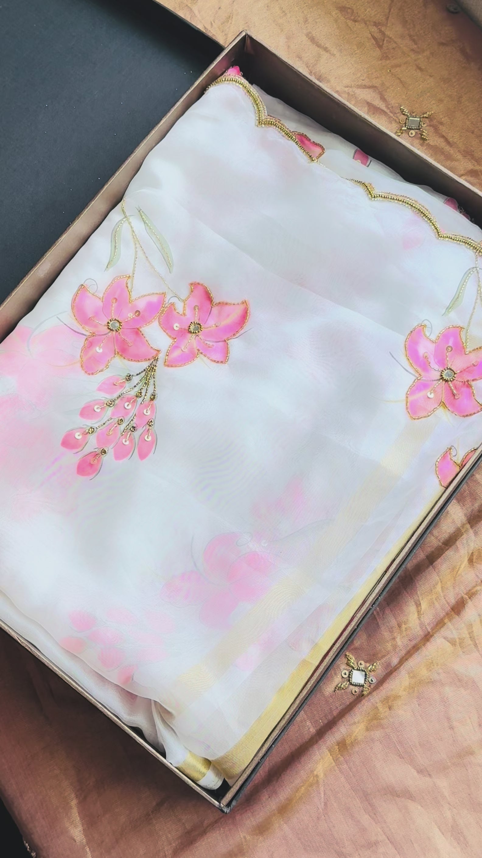 Labrez: White Tissue Chiffon Saree with Handwork and Pink Brocade Blouse