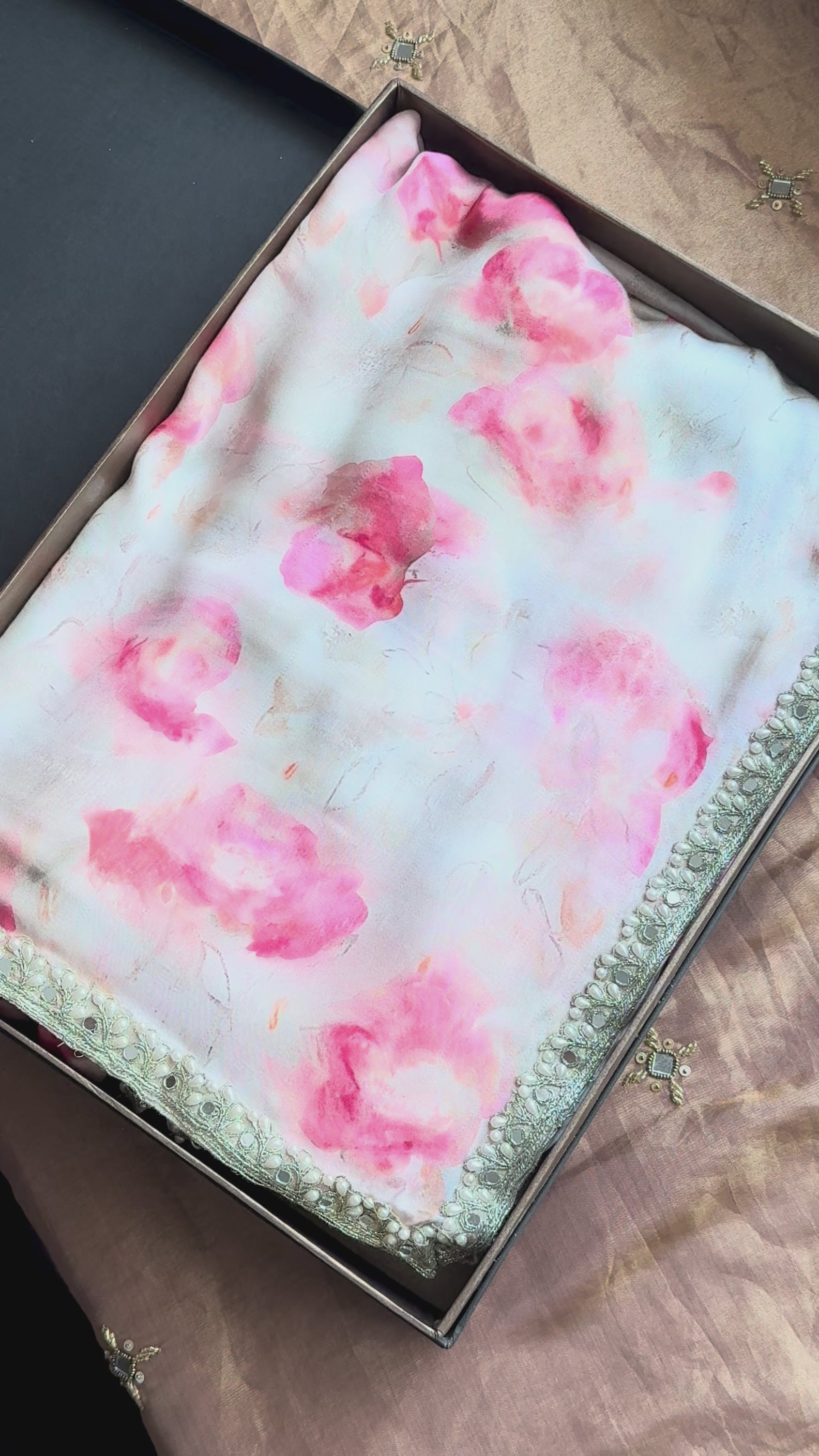 Mahtaab: Ivory Floral Print saree with premium satin blouse
