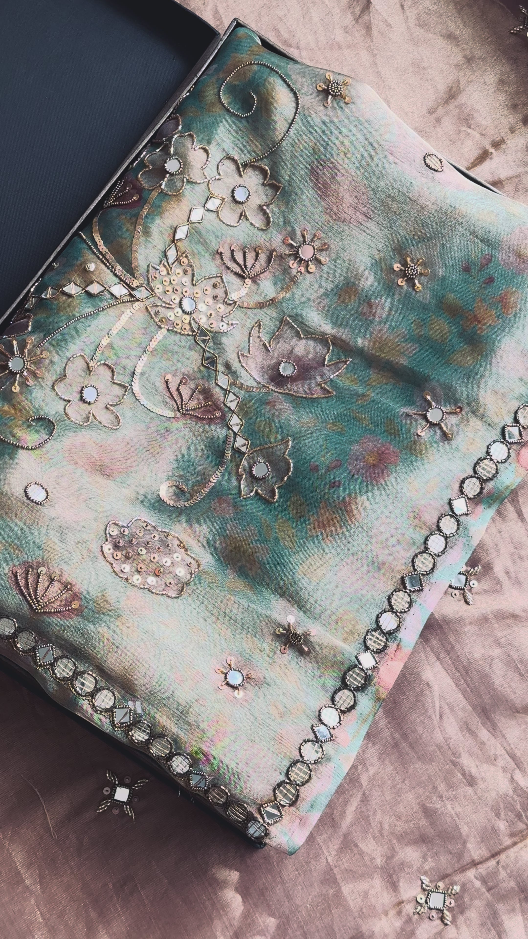 Nargis: Pure Silk Tissue Organza with handwork paired with Pure Raw Silk with handwork