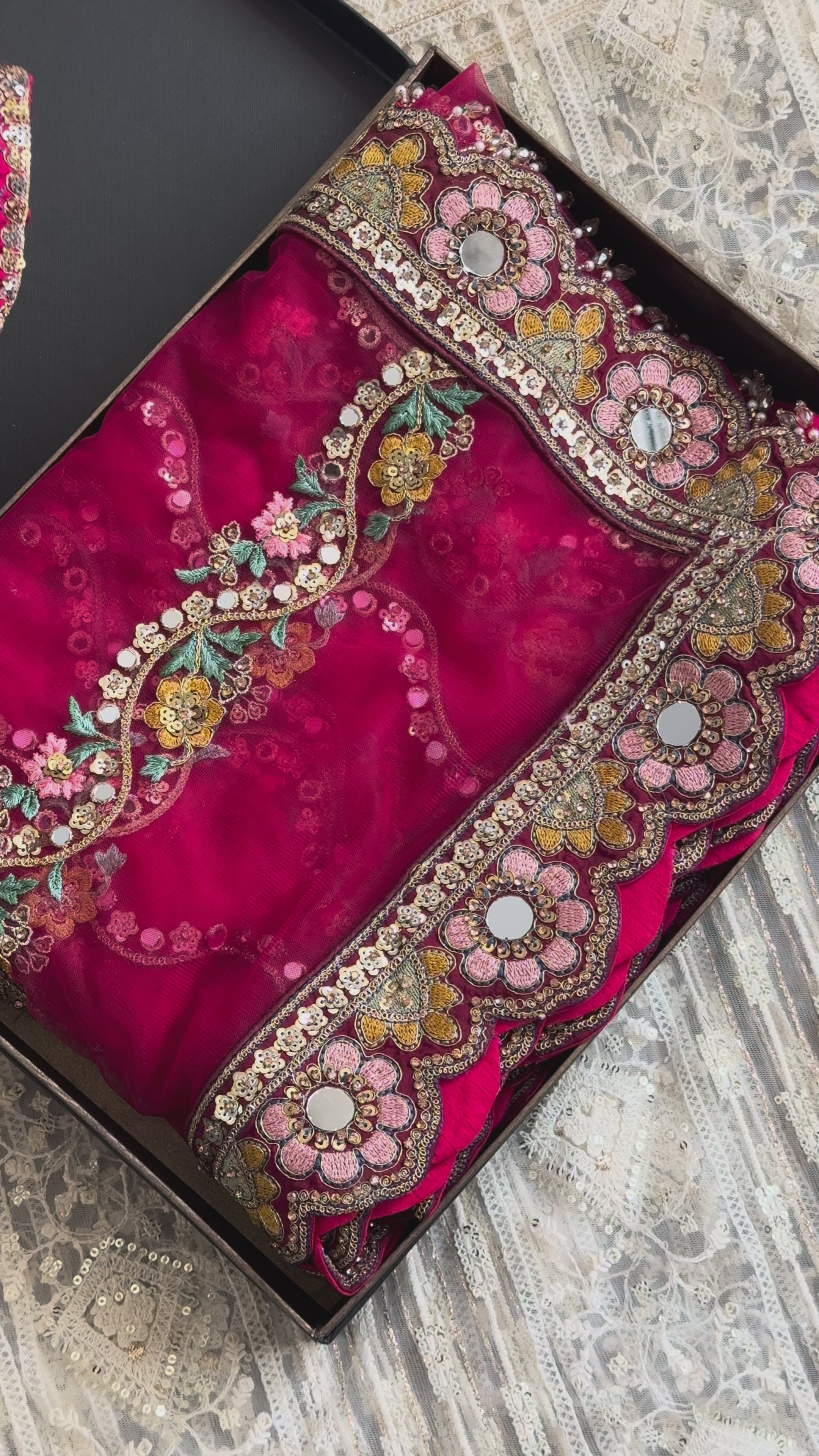 Paradise : Dark Pink Luxury Handwork Soft Net Saree with self blouse
